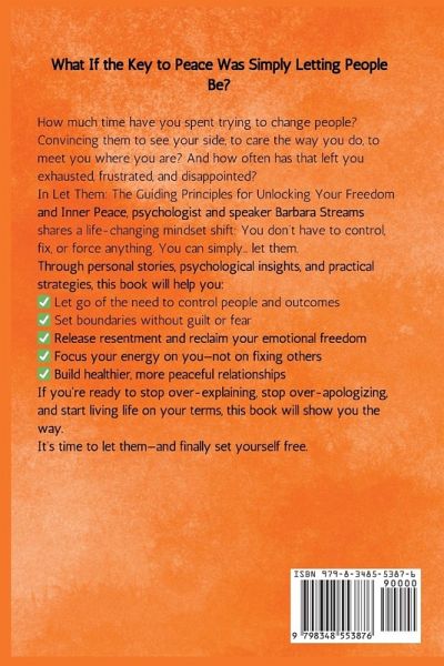 Let Them: The Guiding Principles for Unlocking Your Freedom and Inner Peace Struggling with frustration, disappointment, or the exhausting need to control? It's time to let them-and finally free yourself. Have you ever wished someone would change? Spent hours explaining yourself, trying to make someone understand your perspective-only to feel unheard and drained? What if the secret to happiness wasn't in convincing, fixing, or forcing anything-but in simply letting them? In Let Them, psychologist and speaker Barbara Streams delivers a powerful and life-changing message: You don't have to chase, beg, or control anyone. You can let people be who they are-and in doing so, you set yourself free. Inside This Book, You'll Learn How To: ✔ Stop wasting energy trying to control people and outcomes ✔ Set boundaries with confidence-without guilt or over-explaining ✔ Let go of resentment and free yourself from emotional baggage ✔ Protect your peace while allowing others to be exactly who they are ✔ Transform your relationships by focusing on you, not fixing them Imagine waking up every day feeling lighter, unbothered, and at peace. No more frustration. No more overthinking. No more trying to make people fit into the mould you want them to. Just freedom. ���� Overwhelmed? Exhausted? Ready for a life where you no longer let others dictate your emotions? This book will change the way you think, act, and experience relationships forever. ���� It's time to stop controlling, stop chasing, and start choosing peace. Click "Buy Now" to start your journey toward real freedom today.