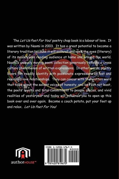 The Let Us Poet For You poetry chapbook is a labour of love. It was written by Naomi in 2003. It has a great potential to become a literary tradition because it will enthrall and open the eyes (literary) of its mainstream reading audience at home and around the world. Naomi's uniquely moving poem collection generously reflects a cross culture phenomenon of written expressions. In other words, poetry lovers can readily identify with passionate expressions of lost and rekindled love relationships. They can concur with the written word that talks about the salient voices of honesty, and last but not least, the poets' loyalty and total commitment to people, places, and vivid realities of yesteryear and today will influence you to open up this book over and over again. Become a couch potato, put your feet and relax. Let Us Poet For You!
