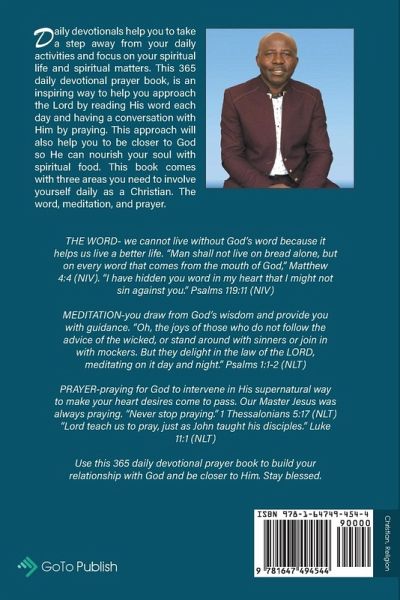 Daily devotionals help you take a step away from your daily activities and focus on your spiritual life and spiritual matters. This 365 daily devotional prayer book, is an inspiring way to help you approach the Lord by reading. His word each day and having a conversation with Him by praying. This approach will also help you to be closer to God so He can nourish your soul with spiritual food. This book comes with three areas you need to involve yourself daily as a Christian. The word, meditation, and prayer.