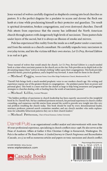 Jesus warned of wolves carefully disguised as shepherds coming into local churches as pastors. It is the perfect disguise for a predator to access and devour the flock one lamb at a time while proclaiming himself as their protector and guardian. The result is spiritual devastation, broken congregations, and even destroyed churches. Darrell Puls attests from experience that the enemy has infiltrated the North American church through pastors with dangerously high levels of narcissism. These pastors hide under layers of the sacred, but it is always an illusion of smoke and mirrors. Puls has experienced this reality from the inside as a staff pastor under a narcissist, and from the outside as a church consultant. He carefully unpacks toxic narcissism in everyday terms, and lets the victims tell their own stories. Let Us Prey, Revised Edition is as real as it gets.