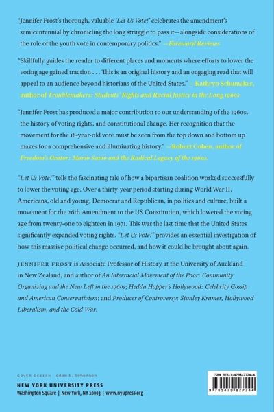 The fascinating tale of how a bipartisan coalition worked successfully to lower the voting age "Let Us Vote!" tells the story of the multifaceted endeavor to achieve youth voting rights in the United States. Over a thirty-year period starting during World War II, Americans, old and young, Democrat and Republican, in politics and culture, built a movement for the 26th Amendment to the US Constitution, which lowered the voting age from twenty-one to eighteen in 1971. This was the last time that the United States significantly expanded voting rights. Jennifer Frost deftly illustrates how the political and social movements of the time brought together bipartisan groups to work tirelessly in pursuit of a lower voting age. In turn, she illuminates the process of achieving political change, with the convergence of "top-down" initiatives and "bottom-up" mobilization, coalition-building, and strategic flexibility. As she traces the progress toward achieving youth suffrage throughout the '60s, Frost reveals how this movement built upon the social justice initiatives of the decade and was deeply indebted to the fight for African American civil and voting rights. 2021 marks the fiftieth anniversary of this important constitutional amendment and comes at a time when scrutiny of both voting age and voting rights has been renewed. As the national conversation around climate crisis, gun violence, and police brutality creates a new call for a lower voting age, "Let Us Vote!" provides an essential investigation of how this massive political change occurred, and how it could be brought about again.