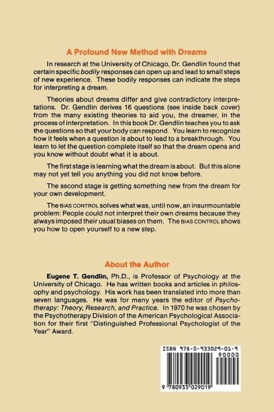 A Profound Method to Work with Dreams In research at the University of Chicago, Dr. Gendlin found that certain specific bodily responses can open up and lead to small steps of a new experience. These bodily responses can indicate the steps for interpreting a dream. Theories about dreams differ and give contradictory interpretations. Dr. Gendlin derives 16 questions from the many existing theories to aid you, the dreamer, in. the process of interpretation. In this book Dr. Gendlin teaches you to ask the questions so that your body can respond . You learn to recognize how it feels when a question is about to lead to a breakthrough. You learn to let the question complete itself so that the dream opens and you know without doubt what it is about. The first stage is learning what the dream is about. But this alone may not yet tell you anything you did not know before. The second stage is getting something new from the dream for your own development. The BIAS CONTROL solves what was, until now, an insurmountable problem: People could not interpret their own dreams because they always imposed their usual biases on them. The BIAS CONTROL shows you how to open yourself to a new step. Eugene T. Gendlin, Ph.D., is Professor of Psychology at the University of Chicago. He has written books and articles in philosophy and psychology. His work has been translated into more than seven languages. He was for many years the editor of Psychotherapy: Theory, Research, and Practice. In 1970 he was chosen by the Psychotherapy Division of the American Psychological Association for their first "Distinguished Professional Psychologist of the Year" Award.
