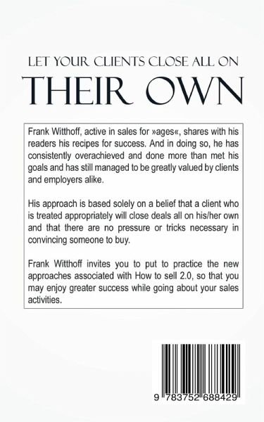 Frank Witthoff, active in sales for »ages«, shares with his readers his recipes for success. And in doing so, he has consistently overachieved and done more than met his goals and has still managed to be greatly valued by clients and employers alike. His approach is based solely on a belief that a client who is treated appropriately will close deals all on his/her own and that there are no pressure or tricks necessary in convincing someone to buy. Frank Witthoff invites you to put to practice the new approaches associated with How to sell 2.0, so that you may enjoy greater success while going about your sales activities.