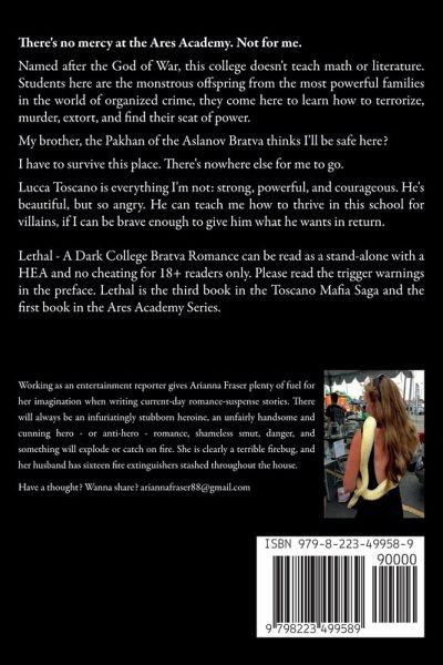 There's no mercy at the Ares Academy. Not for me. Named after the God of War, this college doesn't teach math or literature. Students here are the monstrous offspring from the most powerful families in the world of organized crime, they come here to learn how to terrorize, murder, extort, and find their seat of power. My brother, the Pakhan of the Aslanov Bratva thinks I'll be safe here? I have to survive this place. There's nowhere else for me to go. Lucca Toscano is everything I'm not: strong, powerful, and courageous. He's beautiful, but so angry. He can teach me how to thrive in this school for villains, if I can be brave enough to give him what he wants in return. Lethal - A Dark College Bratva Romance can be read as a stand-alone with a HEA and no cheating for 18+ readers only. Please read the trigger warnings in the preface. Lethal is the third book in the Toscano Mafia Saga and the first book in the Ares Academy Series.