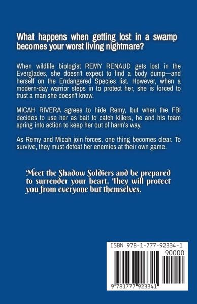 What happens when getting lost in a swamp becomes your worst living nightmare? When wildlife biologist REMY RENAUD gets lost in the Everglades, she doesn't expect to find a body dump-and herself on the Endangered Species list. However, when a modern day warrior steps in to protect her, she is forced to trust a man she doesn't know. MICAH RIVERA agrees to hide Remy, but when the FBI decides to use her as bait to catch the killers, he and his team spring into action to keep her out of harm's way. As Remy and Micah join forces, one thing becomes clear. To survive, they must defeat the enemy at his own game.