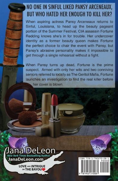 No one in Sinful liked Pansy Arceneaux, but who hated her enough to kill her? When aspiring actress Pansy Arceneaux returns to Sinful, Louisiana to head up the beauty pageant portion of the Summer Festival, CIA assassin Fortune Redding knows she's in for trouble. Her undercover identity as a former beauty queen make Fortune the perfect choice to chair the event with Pansy, but Pansy's abrasive personality make it impossible to get through a single rehearsal without a fight. When Pansy turns up dead, Fortune is the prime suspect. Armed with only her wits and two conniving seniors referred to locally as The Geritol Mafia, Fortune launches an investigation to find the real killer before her cover is blown.