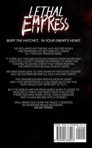 Bury the hatchet... in your enemy's heart. I've reclaimed my throne, and Wylder Noble has demanded his. But war still rages all through Paradise Bend. It turns out this war involves powers from far beyond our little county. Powers determined to bring the fighting to an end, even if that means painting the streets with blood on both sides. We have seven days to take down my psychotic stalker and his soldiers before all our lives are forfeit. The dangerous men who've won my heart and I have never faced a challenge quite like this. Most would say we're not up to it. But the Nobles are far from noble when it comes to tackling a threat, and Mercy Katz is no kitten. There's nothing more lethal than a creature with claws backed into a corner. We'll bring our home the peace it deserves by whatever means necessary... or die trying. *Lethal Empress is the fourth and final book in a new gritty contemporary romance series from bestselling author Eva Chase (writing as Eva Chance) and Harlow King. No major triggers, but be prepared for domineering men who make their own rules, a rebellious heroine who's not afraid to get her hands dirty, and an enemies-to-lovers romance where the girl gets all the guys. It's going to be a wild, bloody ride!*