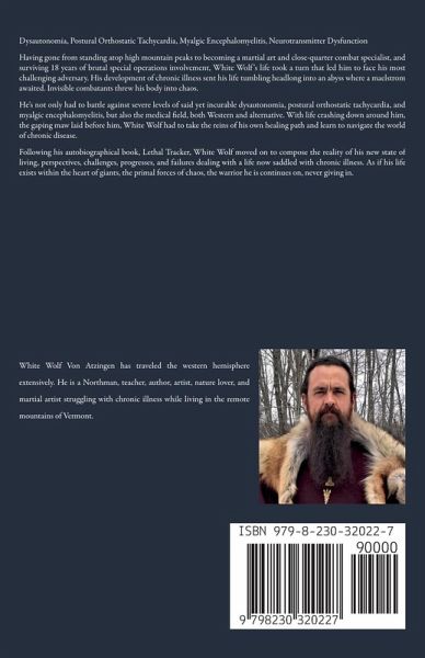 Dysautonomia, Postural Orthostatic Tachycardia, Myalgic Encephalomyelitis, Neurotransmitter Dysfunction Having gone from standing atop high mountain peaks to becoming a martial art and close-quarter combat specialist, and surviving 18 years of brutal special operations involvement, White Wolf's life took a turn that led him to face his most challenging adversary. His development of chronic illness sent his life tumbling headlong into an abyss where a maelstrom awaited. Invisible combatants threw his body into chaos. He's not only had to battle against severe levels of said yet incurable dysautonomia, postural orthostatic tachycardia, and myalgic encephalomyelitis, but also the medical field, both Western and alternative. With life crashing down around him, the gaping maw laid before him, White Wolf had to take the reins of his own healing path and learn to navigate the world of chronic disease. Following his autobiographical book, Lethal Tracker, White Wolf moved on to compose the reality of his new state of living, perspectives, challenges, progresses, and failures dealing with a life now saddled with chronic illness. As if his life exists within the heart of giants, the primal forces of chaos, the warrior he is continues on, never giving in. ~~~ White Wolf Von Atzingen has traveled the western hemisphere extensively. He is a Northman, teacher, author, artist, nature lover, and martial artist struggling with chronic illness while living in the remote mountains of Vermont.
