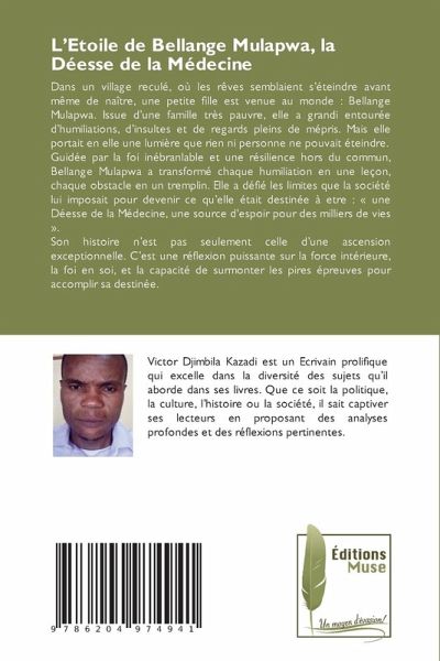 Dans un village reculé, où les rêves semblaient s'éteindre avant même de naître, une petite fille est venue au monde : Bellange Mulapwa. Issue d'une famille très pauvre, elle a grandi entourée d'humiliations, d'insultes et de regards pleins de mépris. Mais elle portait en elle une lumière que rien ni personne ne pouvait éteindre.Guidée par la foi inébranlable et une résilience hors du commun, Bellange Mulapwa a transformé chaque humiliation en une leçon, chaque obstacle en un tremplin. Elle a défié les limites que la société lui imposait pour devenir ce qu'elle était destinée à etre : « une Déesse de la Médecine, une source d'espoir pour des milliers de vies ».Son histoire n'est pas seulement celle d'une ascension exceptionnelle. C'est une réflexion puissante sur la force intérieure, la foi en soi, et la capacité de surmonter les pires épreuves pour accomplir sa destinée.