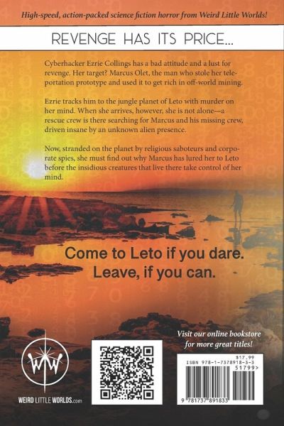 Dark web hacker, Ezrie Collings, and her father James developed a prototype for a revolutionary technology-The Black Door, a teleportation device that makes faster-than-light travel possible around the world and opens up limitless possibilities for interplanetary exploration. Before the device is complete, Ezrie's father dies and his student, Marcus Olet, rebrands the invention as his own and deletes Ezrie and her father from history. Now fifteen years later, Ezrie wants revenge. After receiving a distress call from Marcus on the remote mining planet of Leto, she is willing to risk her life to take his. But when she arrives with her team, she finds that Marcus is missing, his crew driven mad by an unseen alien presence. And when someone destroys their only way back home, Ezrie must choose between saving herself and her team or going into the wilderness to find him. In a world of dangerous technology, religious and political sabotage, and dangers unknown, Ezrie will face her greatest fears on Leto. From the press that brought you Mother: Tales of Love and Terror and Humans are the Problem: A Monster's Anthology comes the first full-length science fiction horror novel from Willow Dawn Becker. Join Ezrie and her crew as they fight the powers of men and monsters on Leto-where nothing really ever dies. Come to Leto if you dare. Leave if you can. Available December 3rd on Amazon and at weirdlittleworlds.com.