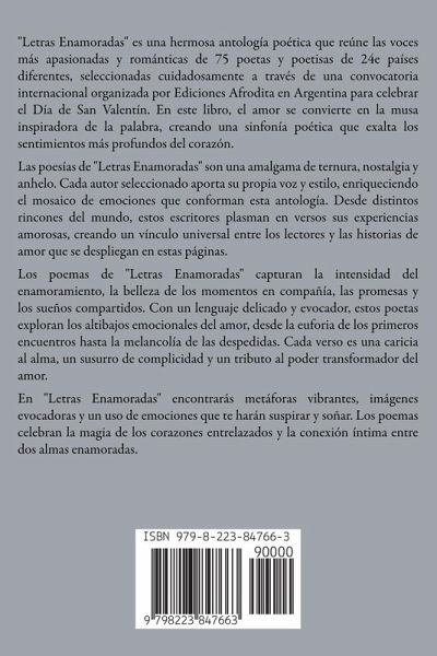 "Letras Enamoradas" es una hermosa antología poética que reúne las voces más apasionadas y románticas de 75 poetas y poetisas de 24e países diferentes, seleccionadas cuidadosamente a través de una convocatoria internacional organizada por Ediciones Afrodita en Argentina para celebrar el Día de San Valentín. En este libro, el amor se convierte en la musa inspiradora de la palabra, creando una sinfonía poética que exalta los sentimientos más profundos del corazón. Las poesías de "Letras Enamoradas" son una amalgama de ternura, nostalgia y anhelo. Cada autor seleccionado aporta su propia voz y estilo, enriqueciendo el mosaico de emociones que conforman esta antología. Desde distintos rincones del mundo, estos escritores plasman en versos sus experiencias amorosas, creando un vínculo universal entre los lectores y las historias de amor que se despliegan en estas páginas. Los poemas de "Letras Enamoradas" capturan la intensidad del enamoramiento, la belleza de los momentos en compañía, las promesas y los sueños compartidos. Con un lenguaje delicado y evocador, estos poetas exploran los altibajos emocionales del amor, desde la euforia de los primeros encuentros hasta la melancolía de las despedidas. Cada verso es una caricia al alma, un susurro de complicidad y un tributo al poder transformador del amor. En "Letras Enamoradas" encontrarás metáforas vibrantes, imágenes evocadoras y un uso de emociones que te harán suspirar y soñar. Los poemas celebran la magia de los corazones entrelazados y la conexión íntima entre dos almas enamoradas. Cada palabra escrita con amor se convierte en una invitación a explorar los rincones más profundos de nuestros propios sentimientos. "Letras Enamoradas" es un libro cautivador que rinde homenaje al amor en todas sus formas y manifestaciones. Esta antología es un regalo tanto para los románticos empedernidos como para aquellos que buscan un momento de inspiración y belleza. Sus páginas contienen una dosis de esperanza, pasión y dulzura que te acompañarán en un viaje poético hacia la magia del amor. Nota: "Letras Enamoradas" es un libro que se recomienda a todos aquellos que creen en el poder del amor y disfrutan de la belleza de la poesía romántica.