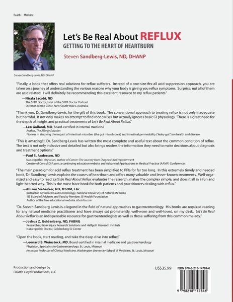With humor, illustrations, and empowerment, Let's Be Real About Reflux lays out in simple terms the complicated causes of reflux . The author, Dr. Steven Sandberg-Lewis, explains how his focus as a naturopathic physician is on finding the root cause of a person's heartburn, considering all aspects of the patient's medical, dietary, behavioral, emotional, and pharmacologic history. In this book, GI physiology is described, standard treatments are critiqued, and diagnostic tests are explained. This thorough evidence-based review of lifestyle and natural medicine options for treatment is a treasure for physicians and heartburn sufferers alike.