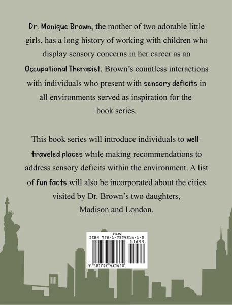 This book series will introduce individuals to well-traveled places while making recommendations to address sensory deficits within the environment. A list of fun facts will also be incorporated about the cities visited by Dr. Brown's two daughters, Madison and London.
