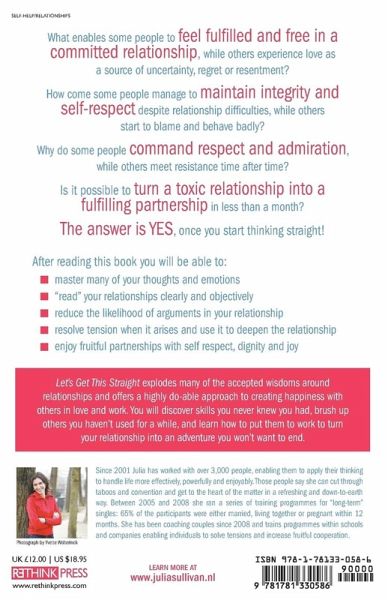 What enables some people to feel fulfilled and free in a committed relationship, while others experience love as a source of uncertainty, regret or resentment? How come some people manage to maintain integrity and self-respect despite relationship difficulties, while others start to blame and behave badly? Why do some people command respect and admiration, while others meet resistance time after time? Is it possible to turn a toxic relationship into a fulfilling partnership in less than a month? The answer is YES, once you start thinking straight! After reading this book you will be able to: master many of your thoughts and emotions; "read" your relationships clearly and objectively; reduce the likelihood of arguments in your relationship; resolve tension when it arises and use it to deepen the relationship; enjoy fruitful partnerships with self respect, dignity and joy. Let's Get This Straight explodes many of the accepted wisdoms around relationships and offers a highly do-able approach to creating happiness with others in love and work. You will discover skills you never knew you had, brush up others you haven't used for a while, and learn how to put them to work to turn your relationship into an adventure you won't want to end.