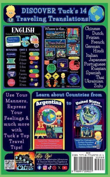 Tuck, a curious and adventurous traveler, has compiled a collection of helpful phrases for fellow globetrotters in this colorful, picture-filled and easy-to-use language reference book. From the chaos of the airport to the winding streets of a new city, Tuck's book is a must-have for any traveler seeking to connect with different cultures. And with the convenience of an E-Book, you can take it with you on all your adventures! With Tuck as your guide, you'll be able to communicate 'hello' and 'thank you' in 15 different languages! And if that's not enough to keep you (and/or your kiddo!) busy during your flight, this book also contains information about 22 capital cities around the globe, their time zones, popular languages, currency & more. With colorful map images and The Goodwin Globetrotters representing their countries, it's fun & informative for any reader or traveler. Use your manners, express your feelings & much more with 'Tuck's Top Travel Tips'! If you're a frequent flyer or have several travelers in your group, be ready to go by having multiple copies ready to roll! A great gift for anyone traveling, curious about or learning languages. As well as anyone with a friend or family member from a foreign land that wants to be able to communicate basic information, express emotions, use manners, ask about cost & for directions to several destinations. You'll be surprised how much information packed into this small tool. Perfect for a child's carry-on bag, in case they need assistance getting around or just want to be more familiar with their surroundings.