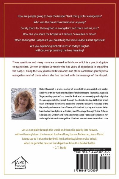 How are people going to hear the Gospel? Isn't that just for evangelists? Who was the Great Commission for anyway? Surely that's for those gifted in evangelism and that's not me, is it? How can you share the Gospel in 1 minute, 5 minutes or more? When sharing the Gospel are you preaching the same Gospel as the apostles? Are you explaining Biblical terms in today's English without compromising the true meaning? These questions and many more are covered in this book which is a practical guide to evangelism, written by Helen Devenish who has years of experience of preaching the Gospel to the lost. Along the way you'll read testimonies and stories of Helen's journey into evangelism and of those she has reached with the message of the Gospel.