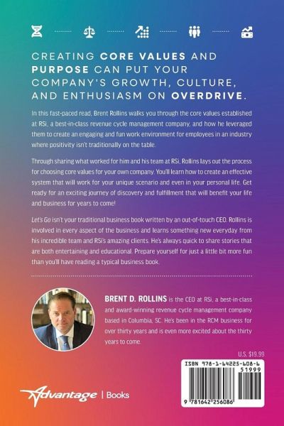 Creating core values and purpose can put your company's growth, culture, and enthusiasm on overdrive. In this fast-paced read, Brent Rollins walks you through the core values he established at RSi, a best-in-class revenue cycle management company, and how he leveraged them to create an engaging and fun work environment for employees in an industry where positivity isn't traditionally on the table. Through sharing what worked for him and his team at RSi, Rollins lays out the process for choosing core values for your own company. You'll learn how to create an effective system that will work for your unique scenario and even in your personal life. Get ready for an exciting journey of discovery and fulfillment that will benefit your life and business for years to come! Let's Go isn't your traditional business book written by an out-of-touch CEO. Rollins is involved in every aspect of the business and learns something new everyday from his incredible team and RSi's amazing clients. He's always quick to share stories that are both entertaining and educational.. Prepare yourself for just a little bit more fun than you'll ever have reading a typical business book.