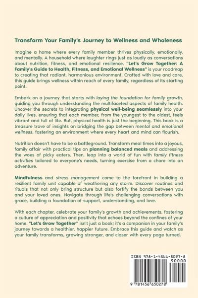 Transform Your Family's Journey to Wellness and Wholeness Imagine a home where every family member thrives physically, emotionally, and mentally. A household where laughter rings just as loudly as conversations about nutrition, fitness, and emotional resilience. "Let's Grow Together: A Family's Guide to Health, Fitness, and Emotional Wellness" is your roadmap to creating that radiant, harmonious environment. Crafted with love and care, this guide brings wellness within reach of every family, regardless of its starting point. Embark on a journey that starts with laying the foundation for family growth, guiding you through understanding the multifaceted aspects of family health. Uncover the secrets to integrating physical well-being seamlessly into your daily lives, ensuring that each member, from the youngest to the oldest, feels vibrant and full of life. But, physical health is just the beginning. This book is a treasure trove of insights on bridging the gap between mental and emotional wellness, fostering an environment where every heart and mind can flourish. Nutrition doesn't have to be a battleground. Transform meal times into a joyous, family affair with practical tips on planning balanced meals and addressing the woes of picky eaters. Then, leap into a world of fun with family fitness activities tailored to everyone's needs, turning exercise from a chore into an adventure. Mindfulness and stress management come to the forefront in building a resilient family unit capable of weathering any storm. Discover routines and rituals that not only bring structure but also fortify the bonds between you and your loved ones. Navigate through life's challenging conversations with grace, building a foundation of support, understanding, and love. With each chapter, celebrate your family's growth and achievements, fostering a culture of appreciation and positivity that echoes beyond the confines of your home. "Let's Grow Together" isn't just a book; it's a companion in your family's journey towards a healthier, happier future. Embrace this guide and watch as your family transforms, growing stronger, and closer with every page turned.