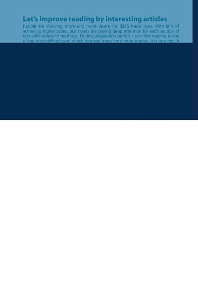 People are showing more and more desire for IELTS these days. With aim of achieving higher score, test takers are paying deep attention for each section of test with variety of methods. During preparation period, I saw that reading is one of the most difficult part, which demand more time more energy. It is true that, it seems impossible that spending time for reading paper based texts and doing some exercises related to them instead of having great time with modern devices in the technological development century. Therefore, we decided to write book (We do not think, we can say it is a book, because it is just like a manual. However, although it looks not as modesty, we did not want to underestimate our work) to help test takers improve their reading skill. Whenever you ask some advice teachers to get higher score from reading, they suggest reading more articles. We also follow this advice with some extra activities. There are 15 articles and some interesting part of books with exercises that help you to adopting IELTS reading questions. This book for intermediate level test takers who want to organize bedtime reading and improve this skill.
