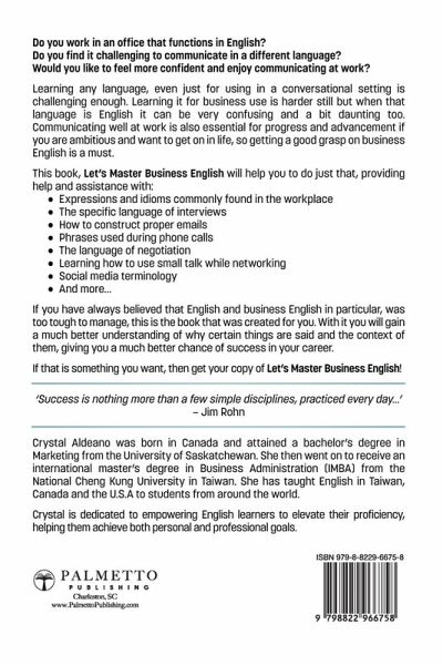 Do you work in an office that functions in English? Do you find it challenging to communicate in a different language? Would you like to feel more confident and enjoy communicating at work? Learning any language, even just for using in a conversational setting is challenging enough. Learning it for business use is harder still but when that language is English it can be very confusing and a bit daunting too. Communicating well at work is also essential for progress and advancement if you are ambitious and want to get on it life, so getting a good grasp on business English is a must. This book, Let's Master Business English will help you do just that, providing help and assistance with: ¿Expressions and idioms commonly found in the workplace ¿The specific language of interviews ¿How to construct proper emails ¿Phrases used during phone calls ¿The language of negotiation ¿Learning how to use small talk while networking ¿Social media terminology ¿And more... If you have always believed that English and business English in particular, was too tough to manage, this is the book that was created for you. With it you will gain a much better understanding of why certain things are said and the context of them, giving you a much better chance of success in your career. If that is something you want, then get your copy of Let's Master Business English!