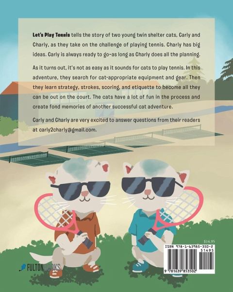 Let's Play Tennis is part of a children's book series, The Adventures of Carly and Charly. The short story picture book can be a perfect gift for your young ones. It also brings an opportunity to teach them the importance of playing different games. This book tells the story of two young twin shelter cats, Carly and Charly, as they take on the challenge of playing Tennis. As they are the cats who love to have fun and adventure, Charly has big ideas. Carly is always ready to go--as long as Charly does all the planning. Let's Play Tennis is one of the few kitten picture books that aim to educate and entertain the little ones about Tennis. As it turns out, it's not as easy as it sounds for cats to play Tennis. In this adventure, they search appropriate equipment and gear for cats. Then they learn strategy, strokes, scoring, and etiquette to become all they can be on the court. The cats have a lot of fun and create fond memories of another successful cats adventure. In fact, it's the best bedtime story for kids that you can get today. The Adventures of Carly and Charly is a perfect cats story book series for pet and cats lovers. It provides them with an opportunity to teach kids to be gentle and loving toward animals. Through this book, one can teach kids about cats love and care. This makes it a perfect bedtime story for kids that can help them learn about cats playing games, and explore new things. Are you looking for illustrated children's book about cats? If yes, Let's Play Tennis is a perfect choice. Get this cats book for kids and give your kids an opportunity to learn about fun adventures. Curious about how it feels to read about cats playing Tennis? Carly and Charly are very excited to answer questions from their readers at carly2charly@gmail.com.