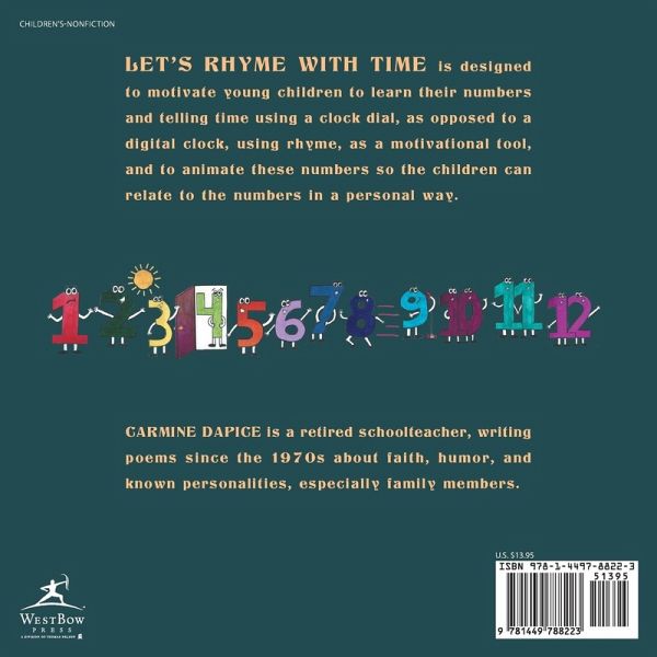 Rhyme with Numbers and Time is designed to motivate young children to learn their numbers and telling time using a clock dial, as opposed to a digital clock, using rhyme, as a motivational tool, and to animate these numbers so the children can relate to the numbers in a personal way.
