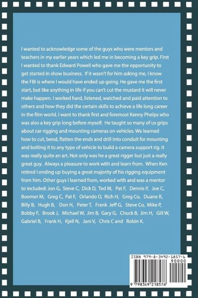 I wanted to acknowledge some of the guys who were mentors and teachers in my earlier years which led me in becoming a key grip. First I wanted to thank Edward Powell who gave me the opportunity to get started in show business. If it wasn't for him asking me, I know the FBI is where I would have ended up going. He gave me the first start, but like anything in life if you can't cut the mustard it will never make happen. I worked hard, listened, watched and paid attention to others and how they did the certain skills to achieve a life long career in the film world. I want to thank first and foremost Kenny Phelps who was also a key grip long before myself. He taught so many of us grips about car rigging and mounting cameras on vehicles. We learned how to cut, bend, flatten the ends and drill into conduit for mounting and bolting it to any type of vehicle to build a camera support rig. It was really quite an art. Not only was he a great rigger but just a really great guy. Always a pleasure to work with and learn from. When Ken retired I ending up buying a great majority of his rigging equipment from him. Other guys I learned from, worked with and was a mentor to included: Jon G, Steve C, Dick D, Ted M, Pat F, Dennis P, Joe C, Boomer M, Greg C, Pat F, Orlando O, Rich H, Greg Co, Duane R, Billy B, Hugh B, Don H, Peter T, Frank Jeff G, Steve Co, Mike P, Bobby F, Brook J, Michael W, Jim B, Gary G, Chuck B, Jim H, Gill W, Gabriel B, Frank H, Kjell N, Jani V, Chris C and Robin K.