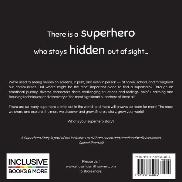 You're used to seeing heroes on screens, in print, and even in person - at home, school, and throughout your community. But where might be the most important place to find a superhero? Right... inside... of... YOU! Let's Share a Superhero Story is a rhyming children's picture book featuring inclusive illustrations with a diverse range of skin tones and styling. A Superhero Story is about pushing past difficult feelings to find inner power and peace. Beginning with relatable examples, it engages and empowers children to acknowledge challenging situations and emotions. It goes on to show how taking a moment to stop, breathe, and visualize can help you recognize, and remember, that you already possess the qualities and abilities you need to overcome any obstacle. We all have an inner superhero! Part of the inclusive Let's Share social and emotional wellness series, A Superhero Story introduces a mysterious character only to reveal its identity as your child's own internal superhero! A special gift, this book is a fun yet mindful way to contribute to: Greater behavior management, social and emotional learning, and overall wellness. More diverse libraries, inclusive classrooms, and empowering schools. More nurturing environments, caring homes, and mindful lives. More self-awareness, self-regulation, and self-esteem. It's not always easy to feel super, even though you most certainly are! No matter how you're feeling or what you're going through, your powers never leave you. You have super strength, a super mind, and a super heart... Together they make a superhero who's ready and waiting to help you through even the most demanding times! Whatever the background... Whatever the obstacle... Let's Share a Superhero Story reminds readers that you can work through anything more mindfully when you activate The Superhero Inside You!