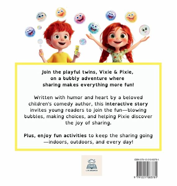 Join the playful redheaded twins, Vixie & Pixie, on a bubbly adventure where sharing makes everything more fun! This delightful interactive storybook is perfect for children aged 2 to 7, blending humor, emotional growth, and hands-on activities to create a magical reading experience. Emotional Growth: Through a fun-filled day at the park, Pixie learns that sharing isn't just about giving something away-it's about making joy even bigger! This heartwarming story helps children understand generosity, teamwork, and the happiness of playing together. Interactive Fun: Young readers are invited to join the adventure-blowing bubbles, making choices, and even helping Pixie discover the joy of sharing. Every page is designed to engage and entertain! Vibrant Illustrations: Lively, colorful artwork brings the twins' bubbly world to life, sparking imagination and capturing the hearts of young readers. Creative Activities: The book includes fun indoor and outdoor activities that encourage children to practice sharing in everyday play-just like Vixie and Pixie! Accessible for All: Designed for young readers, this book features clear text and engaging visuals to support learning and emotional development. Why Parents Love It: "Let's Share Bubbles!" is not just a story-it's a tool to teach kindness and cooperation in a way that feels like pure fun. Written with humor and heart by a beloved children's comedy author, this uplifting story about friendship, fun, and the magic of sharing is a must-have for every child's bookshelf. "Let's Share Bubbles!" is a delightful children's book from the "Vixie & Pixie's New Experiences" series.