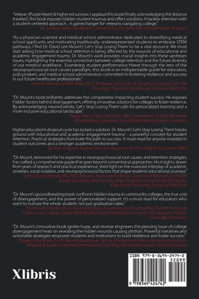 "Veteran (Purple Heart) & higher ed survivor, I applaud this book! Finally acknowledging the 'distance traveled', this book exposes hidden student traumas and offers solutions. It tackles retention with a student-centered approach. A gamechanger for veterans navigating college." Dr. Andrew Kelly, Lieutenant Colonel (LTC), US Army (Ret.), Purple Heart recipient "As a physician-scientist and medical school administrator dedicated to diversifying medical school applicants and motivating traditionally underrepresented students to embrace STEM pathways, I find Dr. David Lee Mount's 'Let's Stop Losing Them' to be a vital resource. We must start asking how medical school retention is being affected by the wounds of educational and academic engagement trauma. Dr. Mount's work provides crucial insights into these upstream issues, highlighting the essential connection between college retention and the future diversity of our medical workforce. Examining student performance threat through the lens of the neuropsychosocial root causes paradigm, this book is an indispensable guide for educators, policymakers, and medical school administrators committed to fostering resilience and success in our future healthcare professionals." John H. Stewart, IV, MD, MBA, FACS; Professor and Chair of Surgery, Associate Dean for Oncology Programs, Morehouse School of Medicine "Dr. Mount's book brilliantly addresses the complexities impacting student success. He exposes hidden factors behind disengagement, offering innovative solutions for colleges to foster resilience. By acknowledging neurodiversity, 'Let's Stop Losing Them' calls for personalized learning and a more inclusive educational landscape." Pastor Debra Terry Stephens, MA; Cornerstone of Faith Ministries Wife/Mother/Comedian/Actor/Writer/Mental Health Assistant Higher education's dropout cycle has lacked a solution. Dr. Mount's 'Let's Stop Losing Them' breaks ground with 'educational and academic engagement trauma' - a powerful concept for student retention. Practical strategies illuminate the path to success. A must-read for anyone invested in student outcomes and a stronger academic environment. Dr. Tom Coaxum, Former Director, Associate VP, VP in Higher Education (Ret.) "Dr. Mount, renowned for his expertise in neuropsychosocial root causes and retention strategies, has crafted a comprehensive guide that goes beyond conventional approaches. His insights, drawn from years of research and practical experience, shed light on the nuanced interplay of academic anxieties, social isolation, and neuropsychosocial factors that shape students' educational journeys." TanYa M. Gwathmey, MS, PHD, Tenured Associate Professor; Director of Research in Health Equity Education and Training, Maya Angelou Center for Health Equity Wake Forest University School of Medicine "Dr. Mount's groundbreaking book confronts hidden trauma in community colleges, the true cost of disengagement, and the power of personalized support. It's a must-read for educators who want to nurture the whole student, not just graduation rates." Shelton M. Charles, Ph.D. Associate Dean of Sciences and Engineering, Forsyth Technical Community College; Father/Role Model/Leader/Mentor/Community Ambassador/ Health Advocate/ Innovator "Dr. Mount's innovative book ignites hope, and reverse engineers the pressing issue of college disengagement head-on revealing the hidden wounds causing attrition. Powerful narratives and actionable strategies empower students and institutions to build resilience and foster success." Nayeka Uitenham, Psy.D. NeuroEducational Clinical Postdoctoral Fellow, Mind Body Institute Beyond; Educator-Centered Professional Coaching; Former Elementary School Educato
