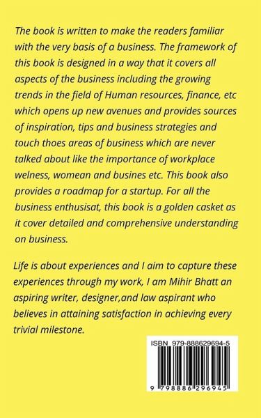 The book is written to make the readers familiar with the very basics of a business. The framework of this book is designed in a way that it covers all aspects of the business including the growing trends in the field of Human resources, finance, etc which opens up new avenues and provides sources of inspiration, tips and business strategies and touch thoes areas of business which are never talked about like the importance of workplace welness, womean and busines etc. This book also provides a roadmap for a startup. For all the business enthusisat, this book is a golden casket as it cover detailed and comprehensive understanding on business.