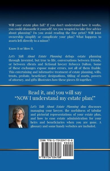Will your estate plan fail? If you don't understand how it works, you could dismantle it yourself! Are you tempted to take free advice about planning? Do you avoid reading the fine print? Will joint ownership simplify or complicate your plan? What happens to assets left directly to a minor? Know it or blow it. Let's Talk About Estate Planning defogs estate planning through invented, but true to life, conversations between friends, or between clients and fictional lawyer Rebecca Dalton. Some of these exchanges expose major errors, not all of them fixable. This entertaining and informative treatment of estate planning, wills, trusts, probate, beneficiary designations, titling of assets, powers of attorney, and gifts illustrates how these pieces fit together. Read it, and you will say "NOW I understand my estate plan!" Let's Talk About Estate Planning also discusses managing your lawyer, the usefulness of tabular and pictorial representations of your estate plan, and how to ease estate administration for your heirs and beneficiaries when you are gone. A glossary and some handy websites are included.