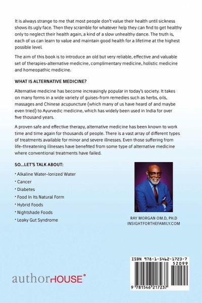 It is always strange to me that most people don't value their health until sickness shows its ugly face. Then they scramble for whatever help they can fi nd to get healthy only to neglect their health again, a kind of a slow unhealthy dance. The truth is, each of us can learn to value and maintain good health for a lifetime at the highest possible level. The aim of this book is to introduce an old but very reliable, effective and valuable set of therapies-alternative medicine, complimentary medicine, holistic medicine and homeopathic medicine. WHAT IS ALTERNATIVE MEDICINE? Alternative medicine has become increasingly popular in today's society. It takes on many forms in a wide variety of guises-from remedies such as herbs, oils, massages and Chinese acupuncture (which many of us have heard of and maybe even tried) to Ayurvedic medicine, which has widely been used in India for over fi ve thousand years. A proven safe and effective therapy, alternative medicine has been known to work time and time again for thousands of people. There is a vast array of different types of treatments available for minor and severe illnesses. Even those suffering from life-threatening illnesses have benefi ted from some type of alternative medicine where conventional treatments have failed. SO…LET'S TALK ABOUT: • Alkaline Water-Ionized Water • Cancer • Diabetes • Food In Its Natural Form • Hybrid Foods • Nightshade Foods • Leaky Gut Syndrome