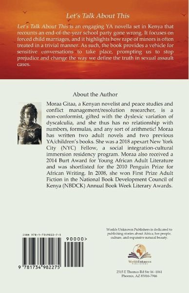 Let's Talk About This begins the morning after two young girls from two different cultural backgrounds, who have both suffered the trauma of rape and sexual assault, meet at the exclusive Angels of Mercy Girl's Crisis Centre in Nairobi. Let's Talk About This handles the issue of rape and sexual assault with sensitivity and comprises an engrossing read for young adults. Let's Talk About This is an engaging YA novella set in Kenya that recounts an end-of-the-year school party gone wrong. The book also focuses on forced child marriages, and highlights how the rape and sexual assault of minors is often treated in a trivial manner. Let's Talk About This attempts to handle the situation of rape by providing a vehicle for this sensitive conversation to take place. Yet, the novella isn't just a YA book about rape. It's a cautionary tale that prompts people to stop prejudice and stereotyping and change the way we define the truth in sexual assault cases. Several questions arise about consent and consistency; consistency is a common test of credibility in courts - should victims be judged on the consistency of their witness statements, even though they might have been drugged, experienced bouts of blackouts and memory loss? Let's Talk About This is written to fit into the current cultural landscape, and it tackles rape and sexual assault in a realistic way, shining a spotlight on the differences between Kenya's social classes and cultural practises. As the story unfolds, the reader is left wondering what has really gone wrong in our society today, when it comes to role models and the blind eye turned to vices such as rape culture and corruption-elements also addressed in the book via two sets of parents who encourage their children to lie and tamper with evidence.