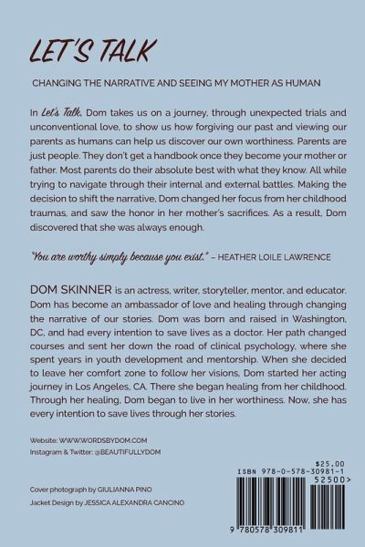 In Let's Talk, Dom takes us on a journey, through unexpected trials and unconventional love, to show us how forgiving our past and viewing our parents as humans can help us discover our own worthiness. Parents are just people. They don't get a handbook once they become your mother or father. Most parents do their absolute best with what they know. All while trying to navigate through their internal and external battles. Making the decision to shift the narrative, Dom changed her focus from her childhood traumas, and saw the honor in her mother's sacrifices. As a result, Dom discovered that she was always enough.