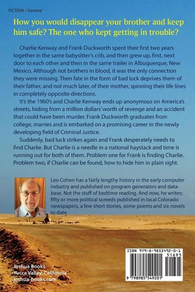 Charlie Kenway and Frank Duckworth spent their first two years together in the same babysitter's crib, and then grew up, first, next door to each other and then in the same trailer in Albuquerque, New Mexico. Although not brothers in blood, it was the only connection they were missing. Then fate in the form of bad luck deprives them of their father, and not much later, of their mother, spinning their life lines in completely opposite directions. It's the 1960's and Charlie Kenway ends up anonymous on America's streets, hiding from a million dollars' worth of revenge and an accident that could have been murder. Frank Duckworth graduates from college, marries and is embarked on a promising career in the newly developing field of Criminal Justice. Suddenly, bad luck strikes again and Frank desperately needs to find Charlie. But Charlie is a needle in a national haystack and time is running out for both of them. Problem one for Frank is finding Charlie. Problem two, if Charlie can be found, how to hide him in plain sight.