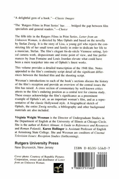 The fifth title in the Rutgers Films in Print Series, "Letter from an Unknown Woman" is directed by Max Ophuls and based on the novella by Stefan Zweig. It is the story of Lisa, a young girl who rejects the constricting life of her small town and family in order to dedicate her life to a musician, Stefan. The film's elegant fin-de-siecle Viennese setting, lyrical camera work, dispassionate and ironic point of view, and fine performances by Joan Fontaine and Louis Jourdan elevate what could have been a mere tearjerker into one of Ophuls's finest works. This volume provides a detailed transcription of the 1948 film. Notes appended to the film's continuity script detail all the significant differences between the finished film and the shooting script. Wexman's introductions to each of the book's sections discuss the history of the film's reception and provide an overview of the central issues the film has raised. A cross section of commentary by well-known critics attests to the film's enduring position as a central text for cinema study. These essays acknowledge the film's significance as a preeminent example of Ophuls's art, as an important woman's film, and as a representative of the classic Hollywood style. A biographical sketch of Ophuls, the entire Zweig novella, a bibliography and other background materials are also included.
