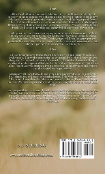 Peggy After the death of my husband, I drowned myself in flowers, a bittersweet memory of the good times we'd shared. I'd had the good fortune to fall in love with a man who wasn't great with words but understood the language of flowers. There had been flowers for every occasion, which culminated into the biggest flower delivery of all, my own shop in the small town of Willow Valley, Peggy's Petals. So I spent all my time and energy building my small flower shop. Eight years later, my friends are trying to encourage me to move on, but how does a person do that and leave behind the guilt they hold? Instead, I tried something safer. My best friend, Trinity, suggested I join the Army pen pal program. It seemed the safest way to test out the waters with someone new, and the best part, we'd never meet, or so I thought. Ethan I'd now been widowed longer than I'd been married and thanks to countless deployments, I knew the men under my command better than I knew my own daughter. As I neared retirement, I wanted to change that. I started talking to my daughter. She explained that she had been doing some volunteer work for a non - profit. She was starting a pen pal program for military men and women and she wanted me to get involved. Apparently, all I needed to do was write a pen pal provided by the non-profit. So, I signed up, and began exchanging letters. This went on for a few months. The more I knew about her, the more I wanted to know. Then kismet played its hand. Melinda, my daughter, and Peggy, my pen pal lived in the same small town. As I prepared for retirement, I finally knew where I wanted to settle down. The military had given mean amazing life, now I wanted the job of being a family man, which meant being with my family. I planned to move to Willow Valley, build a relationship with my daughter, and if I had my way, build one with Peggy too.