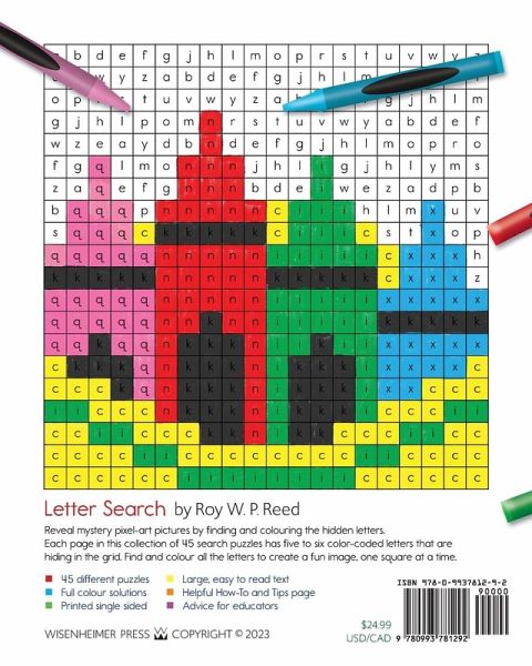 Reveal mystery pixel-art pictures by finding and coloring the hidden letters. Each page in this collection of 45 search puzzles has five to six color-coded letters that are hiding in the grid. Find and fill all the letters to create a fun image, one square at a time. Children can practice recognizing and identifying their letters. Each page is designed so the puzzler has to find a vowel, a letter that gets confused with others, some common letters, and some rarely used ones. Is that a "d" or a "b?" A "p" or a "q?" Adults can enjoy this collection as well, searching, colouring, and guessing what the picture might be. Try something mindful and fun.45 different puzzles Full color solutions Printed single sided Large, easy to read text Helpful How-To and Tips page Advice for educators From the author of these unique puzzle books: Dot to Dot to Dot: 88 Advanced Dot to Dot Puzzles with Extra Dots Painting With Words
