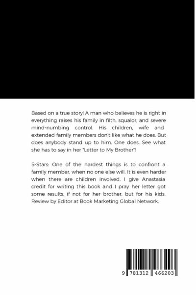 Based on a true story! A man who believes he is right in everything raises his family in filth, squalor, and severe mind-numbing control. His children, wife and extended family members don't like what he does. But does anybody stand up to him. One does. See what she has to say in her "Letter to My Brother"! 5-Stars: One of the hardest things is to confront a family member, when no one else will. It is even harder when there are children involved. I give Anastasia credit for writing this book and I pray her letter got some results, if not for her brother, but for his kids. Review by Editor at Book Marketing Global Network.