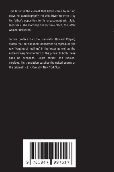 This letter is the closest that Kafka came to setting down his autobiography. He was driven to write it by his father's opposition to his engagement with Julie Wohryzek. The marriage did not take place; the letter was not delivered. 'In his preface he [the translator Howard Colyer] states that he was most concerned to reproduce the raw "venting of feelings" in the letter as well as the extraordinary "momentum of the prose." In both these aims he succeeds. Unlike earlier, and fussier, versions, his translation catches the naked energy of the original.' -- New York Sun, Eric Ormsby The new edition includes the last letter Kafka wrote to his parents as he lay dying of tuberculosis near Vienna in 1924.