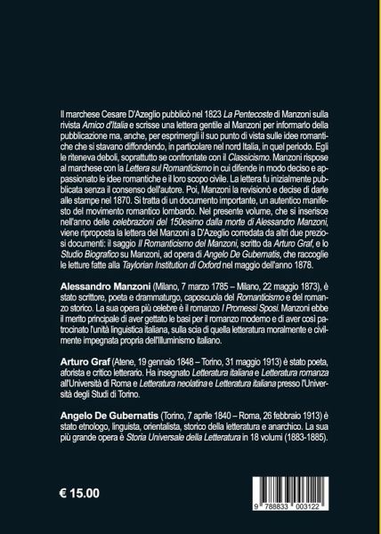 Il marchese Cesare D'Azeglio pubblicò nel 1823 La Pentecoste di Manzoni sulla rivista Amico d'Italia e scrisse una lettera gentile al Manzoni per informarlo della pubblicazione ma, anche, per esprimergli il suo punto di vista sulle idee romantiche che si stavano diffondendo, in particolare nel nord Italia, in quel periodo. Egli le riteneva deboli, soprattutto se confrontate con il Classicismo. Manzoni rispose al marchese con la Lettera sul Romanticismo in cui difende in modo deciso e appassionato le idee romantiche e il loro scopo civile. La lettera fu inizialmente pubblicata senza il consenso dell'autore. Poi, Manzoni la revisionò e decise di darle alle stampe nel 1870. Si tratta di un documento importante, un autentico manifesto del movimento romantico lombardo. Nel presente volume, che si inserisce nell'anno delle celebrazioni del 150esimo dalla morte di Alessandro Manzoni, viene riproposta la lettera del Manzoni a D'Azeglio corredata da altri due preziosi documenti: il saggio sul Romanticismo del Manzoni, scritto da Arturo Graf, e lo studio biografico su Manzoni, ad opera di Angelo De Gubernatis, che raccoglie le letture fatte alla Taylorian Institution di Oxford nel maggio dell'anno 1878.