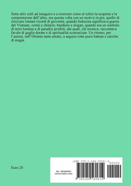 Una breve guida di viaggio in Laos e Cambogia, fatta soprattutto di impressioni, sensazioni ed immagini. Un percorso sotto cieli lontani ad inseguire e a ricercare come al solito la scoperta e la comprensione dell'altro, ma questa volta con un motivo in più, quello di ritrovare lontani ricordi di gioventù, quando Indocina significava guerra del Vietnam, cortei e chitarre, bandiere e slogan; quando era un simbolo di terre lontane e di paradisi proibiti, dai quali, chi tornava, raccontava favole di guglie dorate e di spiritualità sconosciute. Un ritorno, per l'autore, nell'Oriente tanto amato, a seguire rotte poco battute e cariche di magia.