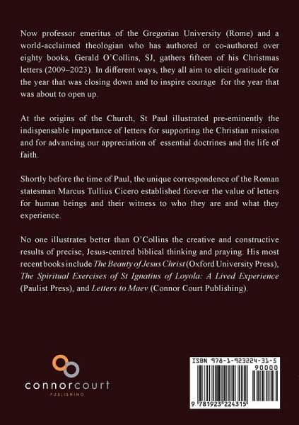 Gerald Collins's last book he published before his death. Now professor emeritus of the Gregorian University (Rome) and a world-acclaimed theologian who has authored or co-authored over eighty books, Gerald O'Collins, SJ, gathers fifteen of his Christmas letters (2009-2023). In different ways, they all aim to elicit gratitude for the year that was closing down and to inspire courage for the year that was about to open up. At the origins of the Church, St Paul illustrated pre-eminently the indispensable importance of letters for supporting the Christian mission and for advancing our appreciation of essential doctrines and the life of faith. Shortly before the time of Paul, the unique correspondence of the Roman statesman Marcus Tullius Cicero established forever the value of letters for human beings and their witness to who they are and what they experience. No one illustrates better than O'Collins the creative and constructive results of precise, Jesus-centred biblical thinking and praying. His most recent books include Facing Up to Jesus in the Gospels and Paul and Letters to Maev (Connor Court Publishing).