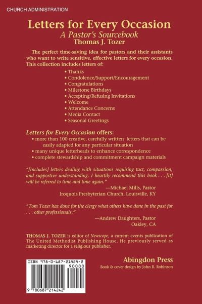 The perfect time-saving idea for pastors and their assistants who want to write sensitive, effective letters for every occasion. This collection includes letters of: * Thanks * Condolence/Support/Encouragement * Congratulations * Milestone Birthdays * Accepting/Refusing Invitations * Welcome * Attendance Concerns * Media Contact * Seasonal Greetings. Letters for Every Occasion offers: *more than 100 creative, carefully written letters that can be easily adapted for any particular situation * many unique letterheads to enhance correspondence * complete stewardship and commitment campaign materials