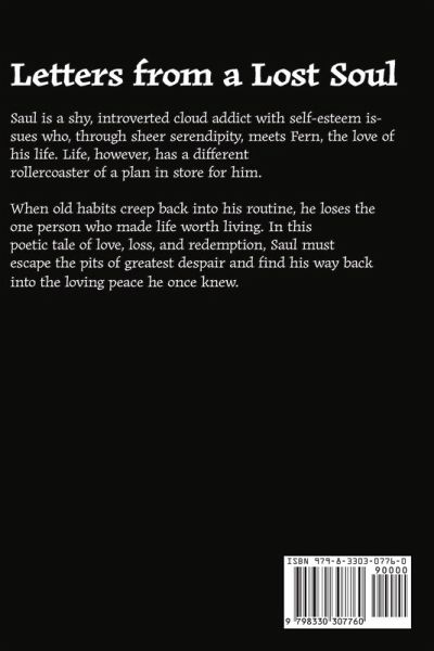 Saul is a shy, introverted cloud addict with self-esteem issues who, through sheer serendipity, meets Fern, the love of his life. Life, however, has a different rollercoaster of a plan in store for him. When old habits creep back into his routine, he loses the one person who made life worth living. In this poetic tale of love, loss, and redemption, Saul must escape the pits of greatest despair and find his way back into the loving peace he once knew. Letters from a Lost Soul explores, through narrative poetry, themes of love, loss, grief, self-worth, depression and healing. By means of therapeutic letters written to himself, Saul paints the picture of a troubled young man struggling with addiction and self-esteem issues who falls headfirst in love with his soulmate. As a series of events leaves him broken and alone, he must find a path to inner peace.
