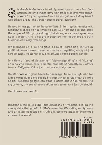 Stephanie Maier has a lot of big questions on her mind: Can Baptists get into Purgatory? Can Noni juice give you superpowers? If your spouse dies, can you get your kidney back? And where are all the Jewish mannequins, anyway? Everyone has gotten so damn serious. In her typical snarky wit, Stephanie takes to her email to see just how far she can push the edges of idiocy by asking total strangers absurd questions about religion. And to her great surprise, the responses are both hilarious and very revealing! What began as a joke to prod an ever-increasing culture of political correctness, turned out to be an uplifting study of just how tolerant, open-minded, and actually good people can be. In a time of "social distancing," "virtue-signaling" and "doxing" anyone who dares veer from the prescribed narratives, Letters from a Religious Nut is just the cure society needs. So sit down with your favorite beverage, have a laugh, and for just a moment, see the possibility that things actually can be good again, because people are good. Forget about the media, the arguments, the social conventions and rules, and just be stupid. God knows we need it!