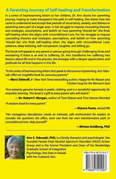 A Parenting Journey of Self-healing and Transformation In a series of heartwarming letters to her adult children, Dr. Ann Yabusaki shares her parenting journey, hoping to make transparent the path to self-healing. She shares how she came to understand and accept that periods of uncertainty, anxiety, and distress in parenting were part of a larger plan. In her struggle to impose counseling theories and strategies, assumptions, and beliefs on how parenting "should be," Dr. Ann finds self-healing when she aligns with Unconditional Love. For her, this meant patience, deep listening, self-compassion, laughter, and letting go. This book will appeal to any parent or person going through challenging times and wondering if there is an end to suffering. Dr. Ann transforms her suffering into lessons about life and in the process, she emerges with a deeper appreciation and gratitude for all that happens in this life.