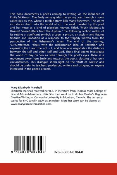 This book documents a poet's coming to writing via the influence of Emily Dickinson. The Emily muse guides the young poet through a town called Bay du Vin, where a terrible storm kills many fishermen. The storm introduces death into the world of art, the world created by the poet and her muse as a kind of placeless heaven. Titled, "Much Madness is Divinest Sense/Letters from the Asylum," the following section makes of its setting a significant symbol: a cage, a prison, an asylum and figures finitude and limitation as a response to the tragedy written from the perspective of the fisherman's wives. The end of the journey, "Circumference, "deals with the Dickinsonian idea of limitation and expansion,the I and the not I, and how one negotiates the distance between the self and other, self and God. These final poems investigate the world of Bay du Vin as seen through the poet's eyes, there is a movement away from Emily and towards the poet's plotting of her own circumference. This dialogue sheds light on the "stuff of poetry" and should be useful to teachers, professors, writers and critiques, or anyone interested in the poetic process.