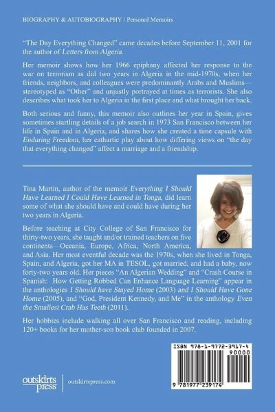 For the author of Letters from Algeria, "The Day Everything Changed" came decades before September 11, 2001. Her memoir shows how her 1966 epiphany affected her response to the war on terrorism as she shares her letters from Algeria in the mid-1970s as well as those of her students after the attacks on September 11 and reflects on what led her to living in a country predominantly Arab and Muslim. Tina Martin, author of the memoir Everything I Should Have Learned I Could Have Learned in Tonga, did learn some of what she should have and could have during her two years in Algeria. Before teaching at City College of San Francisco for thirty-two years, she taught and/or trained teachers on five continents--Oceana, Europe, Africa, North America, and Asia. Her most eventful decade was the 1970s, when she lived in Tonga, Spain, and Algeria, got her MA in TESOL, got married, and had a baby, now forty-two years old. Her pieces "An Algerian Wedding" and "Crash Course in Spanish: How Getting Robbed Can Enhance Language Learning" appear in the anthologies I Should have Stayed Home (2003) and I Should Have Gone Home (2005), and "God, President Kennedy, and Me" in the anthology Even the Smallest Crab Has Teeth (2011). Her hobbies include walking all over San Francisco and reading, including 120+ books for the mother-son Jo-Mama Book Club, founded in 2007.